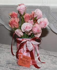 I got the idea for these from a magazine last year (Romantic Homes, perhaps?), but never got around to doing it for May Day last year. Just take a tin can (like a soup can), remove the label and wash out the can. Then cover the can with pretty paper. I used Modge Podge to put mine on, but I'm sure you could just use a white craft glue. I wanted to make mine a touch more resistant to water in case the water spilled, so that's why I decided to decoupage. Add some pretty seam binding or other ribbon, tying off a loop on the back to allow the "vase" to be hung, add water and your favorite flowers and voila, you have a lovely little gift for your friends and neighbors for May Day or for any day that you want to make just a little more special. You could also embellish with pretty lace or other trims, but I thought my paper was nice enough that any more would just be too much. Pretty simple, but pretty neat because most people won't take the time to do such a fun little project, so you get style points for being so "artistic" with a minimum of effort! And your friends get a great day brightener. Now that's what I call a win-win situation...