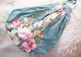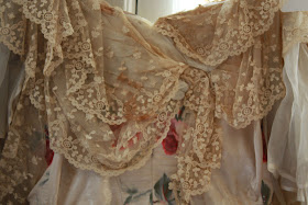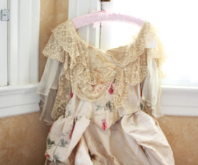 The shabbiest antique silk skirt and blouse dripping with character.  Also mostly falling apart, but it was SO pretty, I had to rescue it anyway.  The fabric is a watered silk with pink roses.  My pictures didn't even come close to doing it justice, but trust me, it is divine.