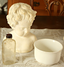 I don't have much to blog about right now, but I was out and about a few days ago and came home with these three treasures. When I sat them on the table, I realized I had a little bit of creamy white beauty to share for White Wednesday. I love the rusty topped bottle. I have an idea for some Halloween decor. We'll see if I actually get a ROUND TUIT. As for the little bust, I can't resist these precious beauties. I have an idea for it too. I'll keep my mouth shut for now in case it looks stupid! And then there's the deep ironstone bowl. I am sure I could think of a hundred ways to use it. It may end up on my Etsy site but...maybe I'll love on it a little first. :-)