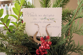 My friend down the street is a talented calligraphy and watercolor artist. She had an open house for Christmas and gave us all a pretty card of our choosing and I loved this quote from Rudyard Kipling, beseeching us to delight in simple things. Obviously, meant for me. I gave it a decorative clip around the edges and then put it in the center of the greenery with an old band instrument music holder.