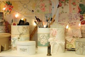 I had great fun making storage containers to hold my bits and bobs. It's amazing what you can do with peanut butter jars, spice tins, and tin cans when you have a can of white spray paint and lots of pretty papers...
