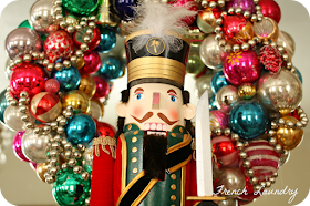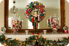 As usual, I digress. Back to the mantel. I made this vintage ornament wreath several years ago when they became kind of popular and you could only find them in a few cool shops and they were made with real vintage ornaments and they were super pricey, like close to $100. I, being the dedicated DIY'er that I am, proclaimed, "I could do that and it wouldn't cost $100 either." I began scouring eBay for vintage ornament lots and the glass garlands on the cheap. In usual fashion, I'm sure I went overboard and bought many more than was necessary which is probably how I came to have like 10 strands of vintage glass garlands and boxes and boxes of vintage ornaments. I'm fairly certain if I were to add up the cost of this baby, it wouldn't be a dime over $95 plus my time, so chalk up another shrewd business deal to my column. OK, maybe not that bad, but after all of the glue gun burns I incurred on this one, I'm not sure it was really worth it. Digressing again...anyway, I'd not had it out in a couple of years and I decided I'd really like to use it so, I cleared my mantel that is usually layered with several white mirrors over top of the big antique gold one and suspended the ornament wreath with a fishing line. I took a couple of big glass jars that I already had and filled them with some of the aforementioned glass garlands and vintage ornaments. I liked the look of that and wanted to keep it simple in a fancy way, so I just added a couple of mercury glass votives and called it good. That is, until a day later when my cute 9 year old boy was helping me with the tree and just disappeared, going up to his room. He reappeared a moment later carrying his treasured nutcracker that he got at an estate sale a couple of years ago. He put it on the mantel in front of the wreath. Despite my control freak tendencies, I had to admit, I liked it. Then my 13 year old disappeared and came down bearing his Christmas snow globe which he added to one side. I liked it, too. I told the 9 year old to go bring HIS Christmas snow globe down and we added it to the other side. Then, we ALL liked it. Best of all, it was a family effort and that is really special. What do you think?