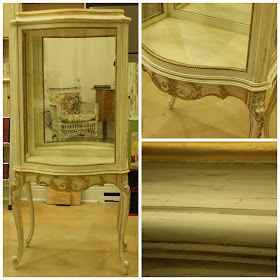 So I've been looking for an antique French vitrine or curio for some time now.  I never have found one that I liked that was for sale prior to the end of last year or at least not at a price point I felt I could afford. Then a couple of months ago, my husband and I visited an estate sale on the 3rd and last day.  Just went for giggles, no big expectations because all of the "good stuff" was probably already gone, right?  Then, what to my wandering eyes did appear but this little cutie.  It was not terribly old, maybe only 20 or 30 years, but it had all of the right lines, beautiful curved glass, and since it wasn't really old, it was in great shape (read NOT a project and a half).  The only reason I could figure it was still there was because it was not a great finish.  Not horrible, just not inspiring.  I asked the lady running the estate sale what she could do on it and it was less than $200.  I snatched it up posthaste and knew it was going to be painted creamy white when I was done with it.  It took a few weeks before I got "a round toit" for the redo, but I finally did it.    This first collage is of the "before". Pardon the messy studio, but it is a work space after all! :-)