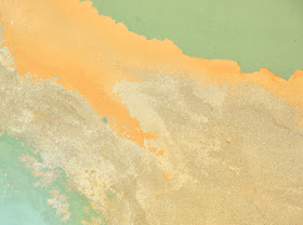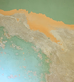 Anyway, for whatever reason, today I actually SAW this wall as I was preparing to do my folding. I don't know if it was the light coming in from the bulkhead door or what, but it struck me that it was like a piece of art-house art, if you will. I noticed the layers of paint, revealing the 1940-50's green which had been painted over the earlier peach, which was over the sandy undercoat (the part that crumbles pretty much constantly). I noticed the pits and textures and the way that it had gradations in the colors. I took the shop vac out and vacuumed the spidery webs and the fuzz that had stuck in the wall (I apologize to the squeamish for that visual!). Then, I went upstairs and fetched my camera. I played with taking pictures of THE WALL and then came upstairs to my laptop and did some cropping and was surprised at how much the photos looked like some cool piece of abstract art.
