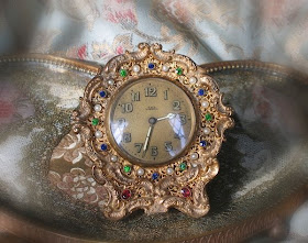 When I first started blogging, I stated a desire to share some of my own favorite collections with you. As promised, here is the first of those collections, my vintage rhinestone clocks. I have other clocks as well, but for now, we'll stick with the sparkly ones. This collection is one that is not only beautiful to look at, but is rather humorous to me, as well. It has nothing to do with the uniqueness of the collection, because, as you are probably well aware, collecting vintage rhinestone clocks has becomes so popular, its almost a cliche'. What is funny about little moi collecting clocks is...I'm always running late! My time challenge, as my husband calls it, is something that I've been wrangling with for years. Now I know its rude, inconsiderate, annoying, and sometimes all of the above to be late. I KNOW! I just can't seem to shake trying to cram too many things in too little time. On a good day, I'm not late...I'm never, and I mean NEVER early. My parents were always early, my children seem to have the propensity for being early or, at least, on time. It must skip a generation because I think my siblings also suffer from this affliction. So, you can see why having clocks as one of my collections is sort of funny. But, as would be fitting, I can tell you that most of them DON'T WORK! Of course, they don't...they're mine!