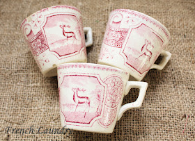 I found these little tiny cups at the thrift store. They are very old English paste porcelain. I can't tell you how to distinguish this type of porcelain, I can only tell you that once you get a feel for how it looks and feels, you will be able to recognize it too. A lot of the old transferware pieces that I love were made this way.
