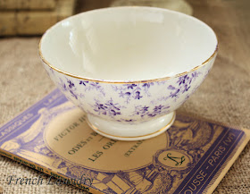 The little cafe au lait bowl was an Etsy find that arrived from France this week. It is OLD and soooooo pretty with its little purple flowers. It looks great on the French booklet I found at an antique mall.